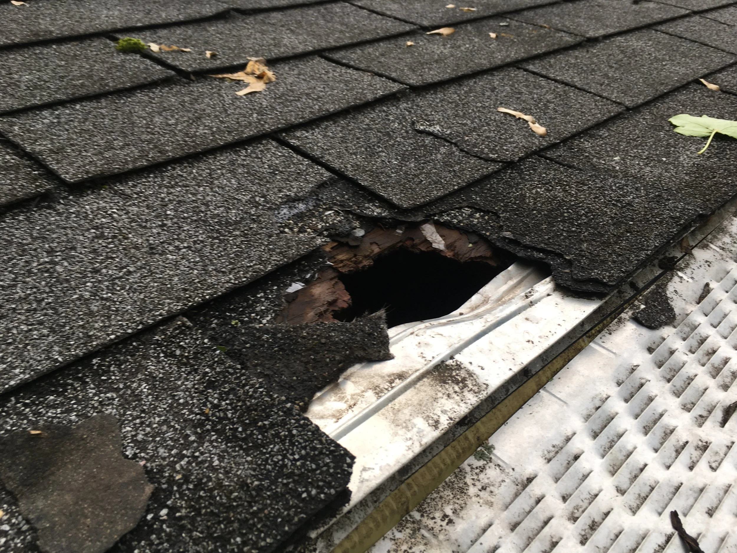 Raccoons are one of the most adaptable species of urban wildlife. Unfortunately, this also often brings them into conflict with people. Raccoons are quite fond of getting into attics and garages to use as den sites. They have a number of ways to do this as I found out in a recent project. The raccoons were climbing up the siding on the side of the garage (see the paw prints in the picture) and had removed a number of pieces of the soffit as well as chewing a hole in the roof! Since there were a number of dogs, cats, and skunks in the area, standard live traps on the ground were not a good option as non-target species could be captured or injured accidentally by the dogs. I used a specialized live trap, built by Comstock traps, and attached it vertically to the wall so only raccoons climbing in or out of the building would be captured. This ensured there were no raccoons remaining in the garage after a short period of time and the entry points were properly sealed to prevent them from reentering in the future.